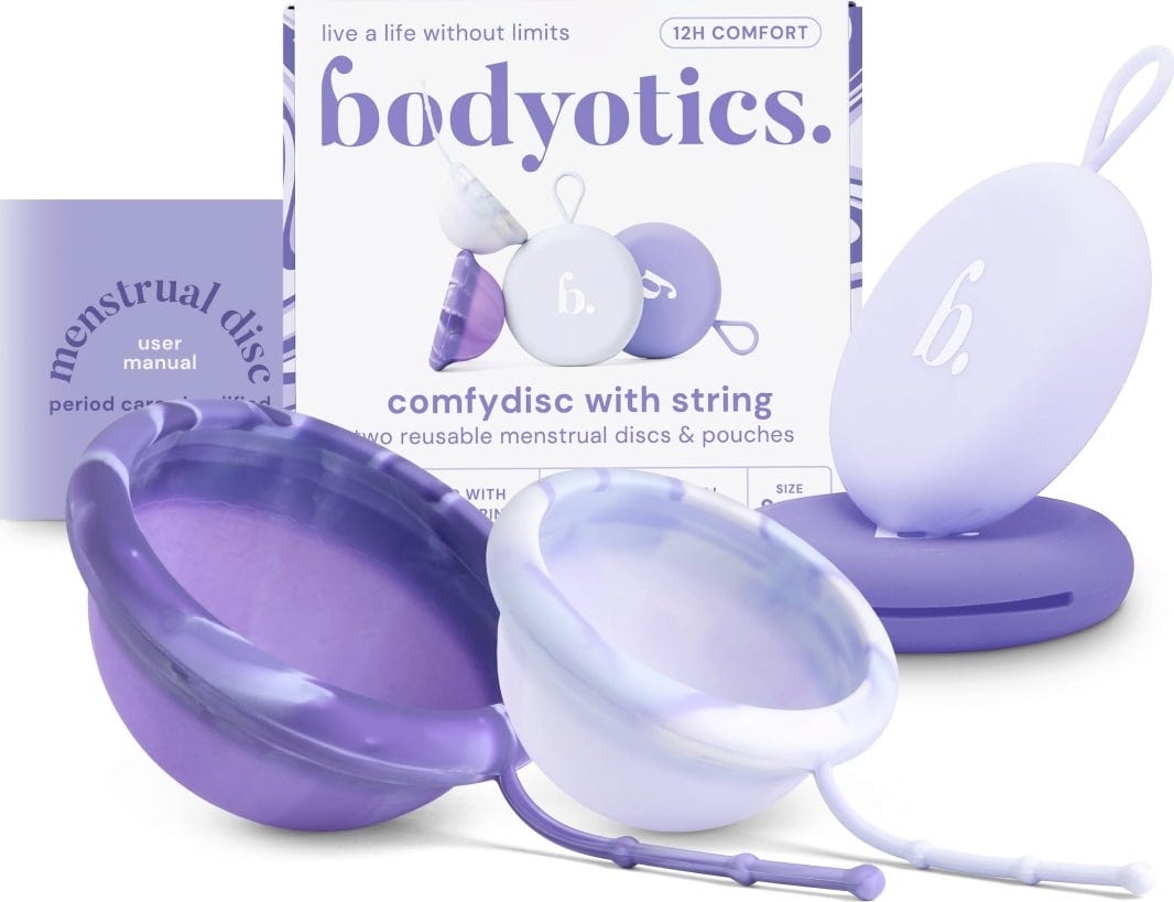V tejto sade Comfydisc od spoločnosti Bodyotics nájdete 2 menštruačné disky rôznych veľkostí pre slabé aj silné krvácanie. Disky je možné ľahko vybrať a keďže sada obsahuje aj 2 silikónové obaly, menštruačný disk si môžete kedykoľvek vymeniť aj na cestách, ak nemáte možnosť ho vymyť.
