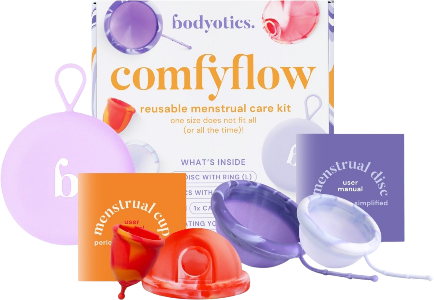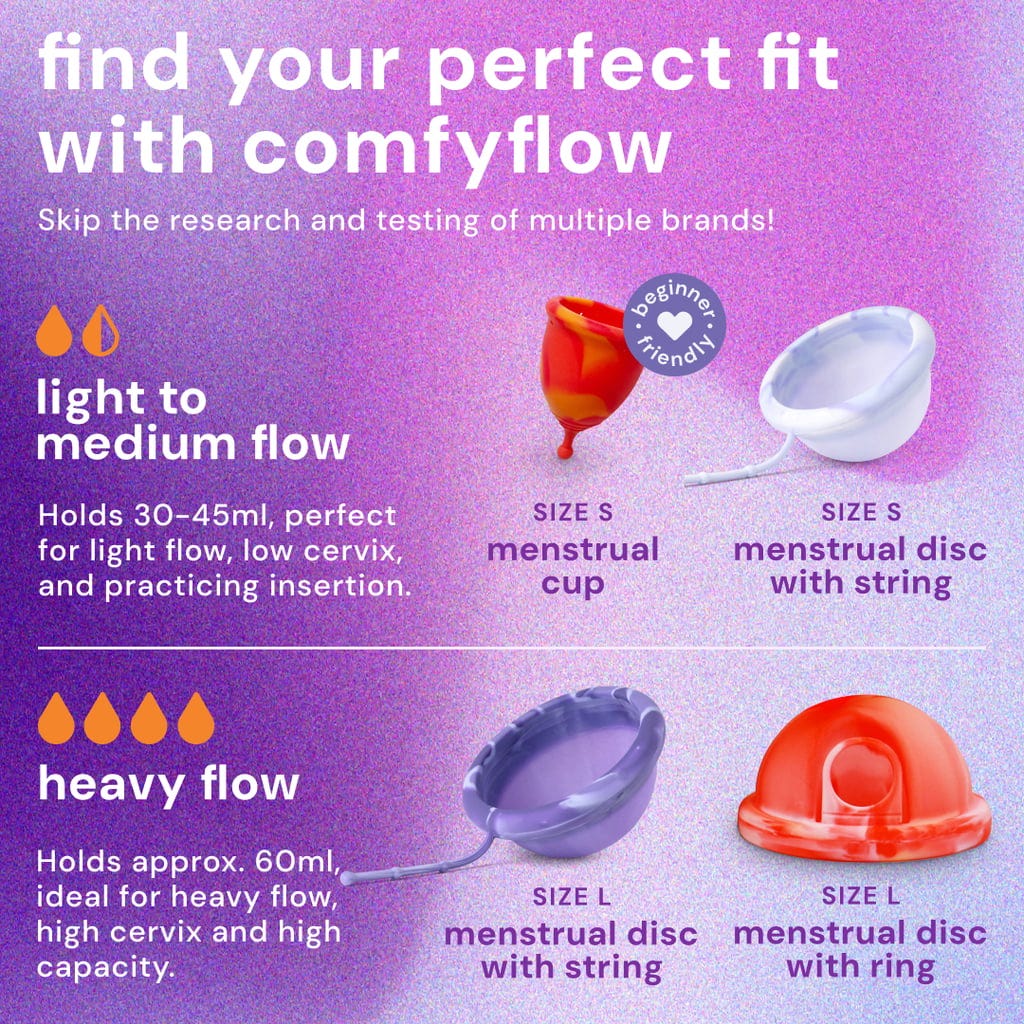 Ak s používaním menštruačných kotúčov začínate, sada Comfyflow od spoločnosti Bodyotics by mohla byť pre vás tým pravým. Keďže na používanie menštruačných kalíškov si musíte najprv zvyknúť, sada obsahuje malý menštruačný kalíšok, s ktorým môžete cvičiť pred prechodom na disky.