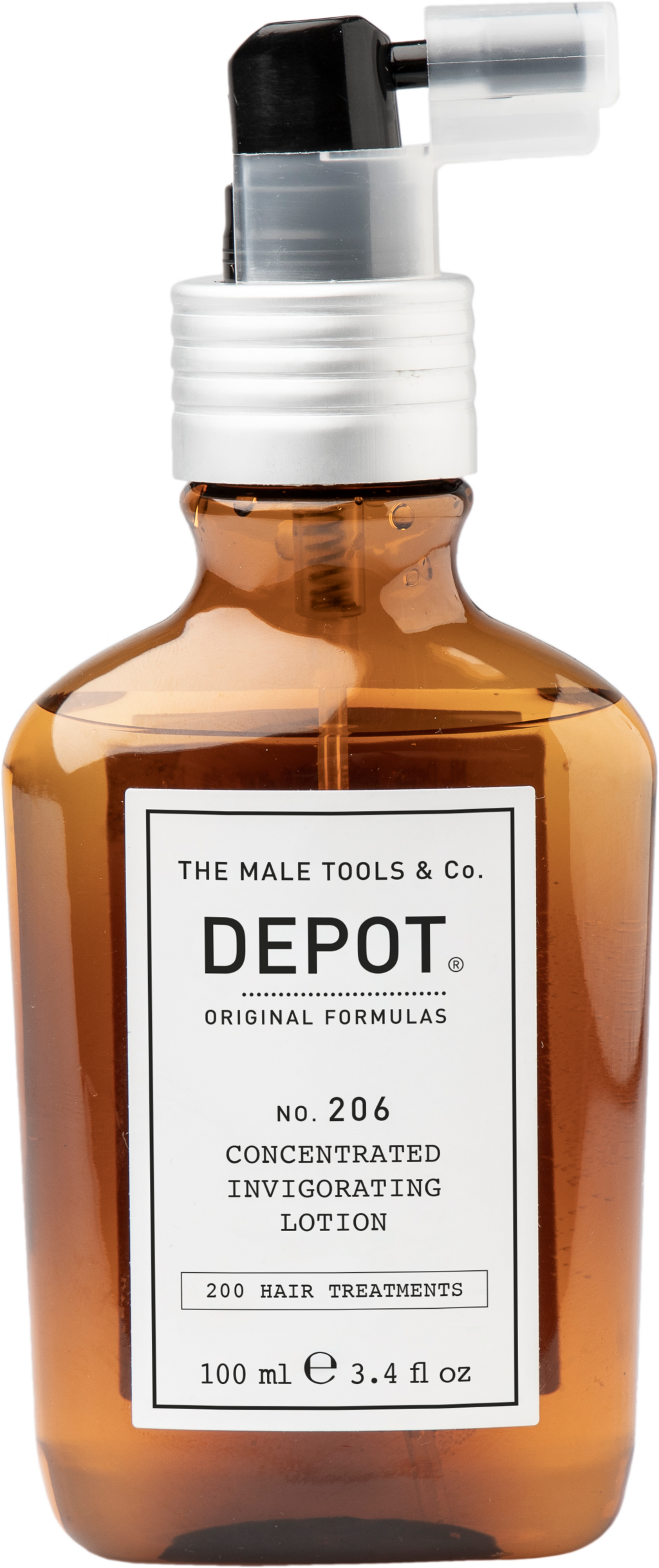 N° 206 Concentrated Invigorating Lotion značky Depot je leave-in mlieko špeciálne pre tenké vlasy. Je obohatené o vitamínový komplex, gáfor, extrakt z arniky a rozmarínu, eukalyptol a mentol.