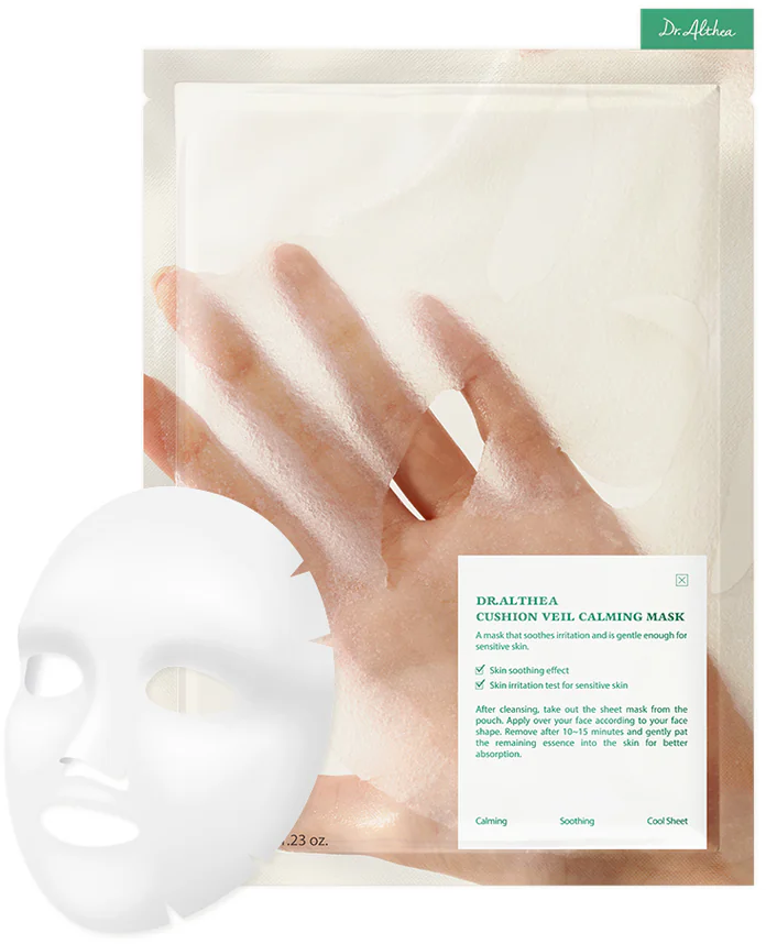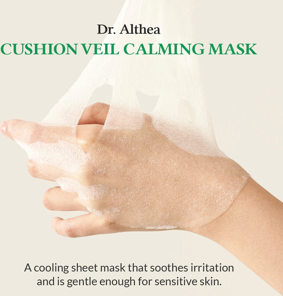 Cushion Veil Calming Mask od Dr. Althea je ako malá oáza pohody pre citlivú pleť. Jemný chladivý účinok inovatívnej gélovej technológie s Cold-Stone práškom pocítite hneď po nanesení. Vďaka komplexu cica, výťažku z harmančeka a panthenolu bude vaša pleť rýchlo vyváženejšia, intenzívne hydratovaná a odolnejšia. Vychutnajte si 10 - 15 minút čistej relaxácie a po nej zažijete viditeľne menej podráždenú, hladšiu a jemnejšiu pleť!