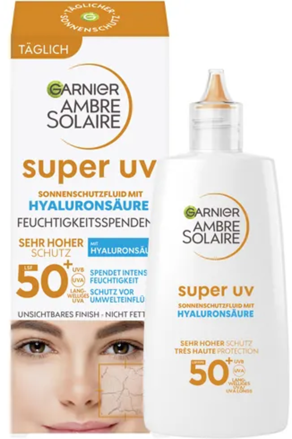 Fluid AMBRE SOLAIRE Sensitive expert+ od GARNIER, špeciálne vyvinutý pre citlivú tvár a očné okolie, chráni pokožku pred spálením s veľmi vysokým SPF 50+, UVA a UVB filtrom. Ponúka tiež ochranu pred dlhovlnným UVA žiarením – tieto lúče prenikajú obzvlášť hlboko do pokožky a sú zodpovedné za starnutie pokožky súvisiace so slnkom, ktoré sa prejavuje nepeknými vráskami a tmavými škvrnami. Hyaluron tiež dodáva pokožke cennú hydratáciu.