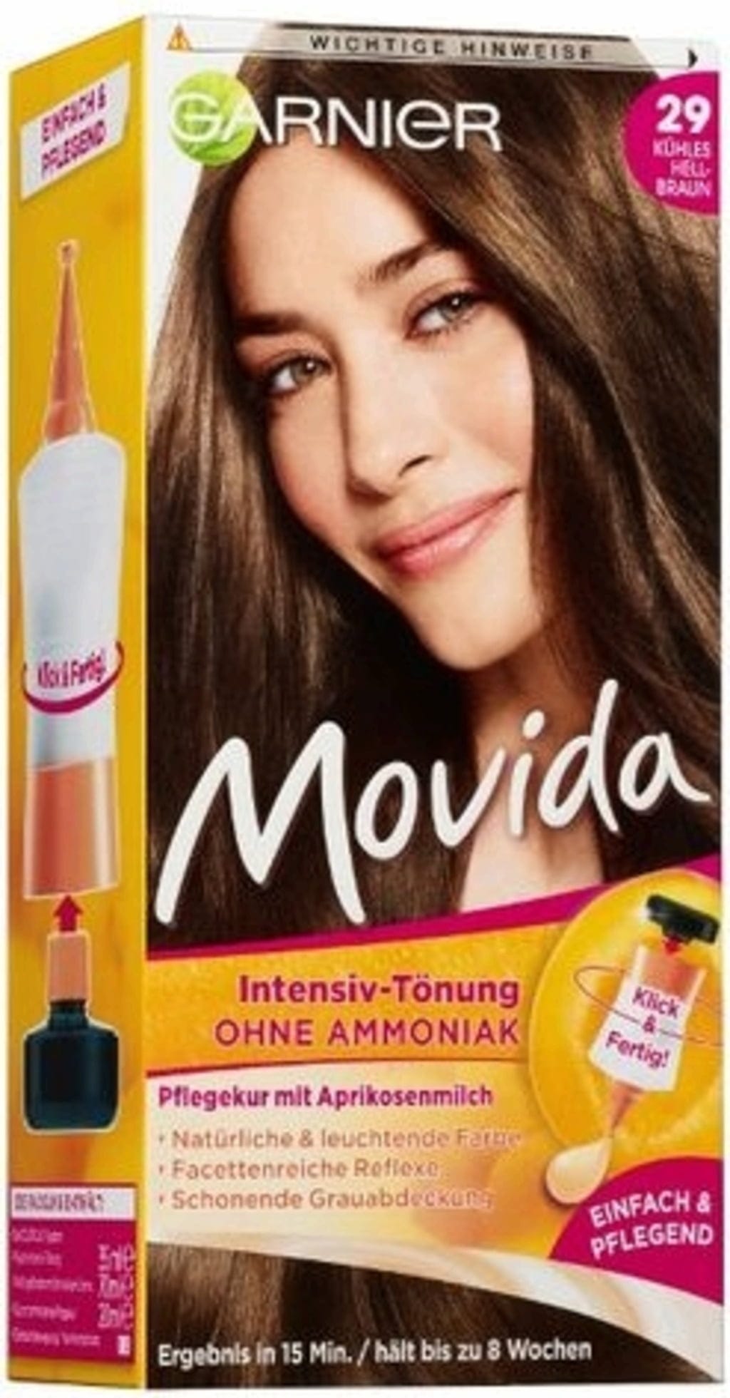 Farba na vlasy Movida od GARNIER dodá vašim vlasom prirodzenú žiarivú farbu v chladnej svetlohnedej, jemne prekryje šediny a vykúzli vo vlasoch mnohostranné odlesky. Aplikácia je veľmi jednoduchá vďaka systému COLORCLIC, výsledok je viditeľný už po 15 minútach. Tónovací krém je bez amoniaku a preto príjemne vonia. Pre žiarivý farebný výsledok až po dobu 8 týždňov. Priložený ošetrujúci krém s marhuľovým mliekom zaisťuje hladké vlasy po farbení.