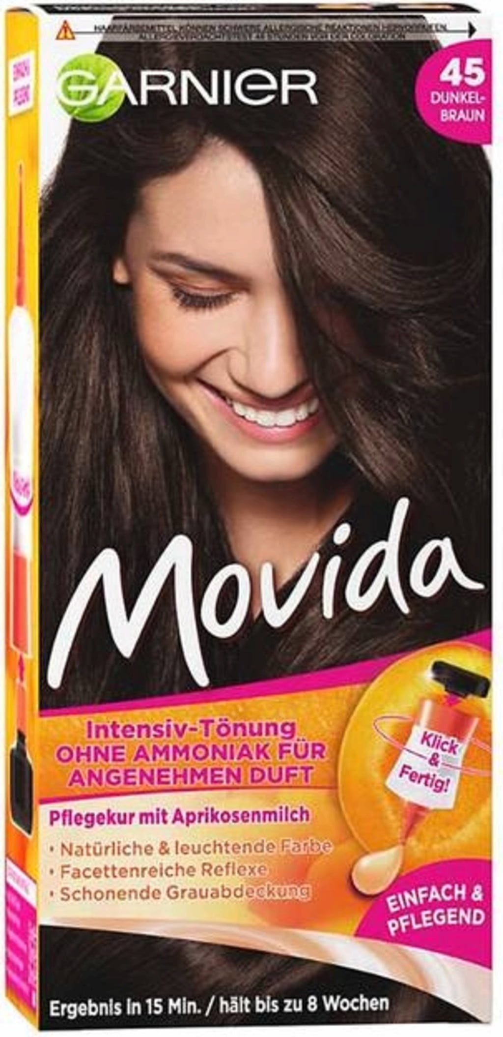 Farba na vlasy Movida od GARNIER sa rýchlo a jednoducho používa, šetrne kryje šediny a vydrží až 8 týždňov. Žiarivý, živý, tmavohnedý tón sa dosiahne už po 15 minútach. Farba príjemne vonia, pretože neobsahuje amoniak. Ošetrujúca kúra s marhuľovým mliekom, ktorá sa používa po zafarbení, zaisťuje vláčnosť a objem.