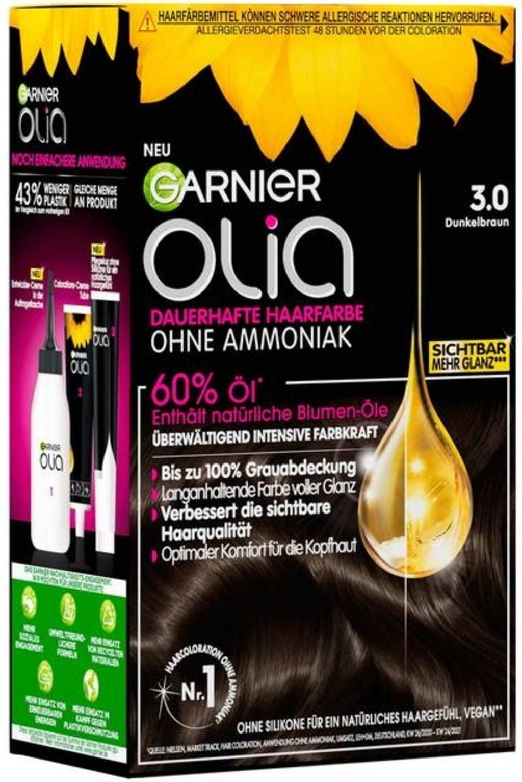 Rýchla a jednoduchá aplikácia, profesionálny výsledok: S permanentnou farbou na vlasy Olia od GARNIER v odtieni 3.0 tmavohnedá budú vaše vlasy žiariť sýtym, lesklým hnedým tónom už po 30 minútach. Dokonca aj šedivé vlasy sú dokonale prekryté.