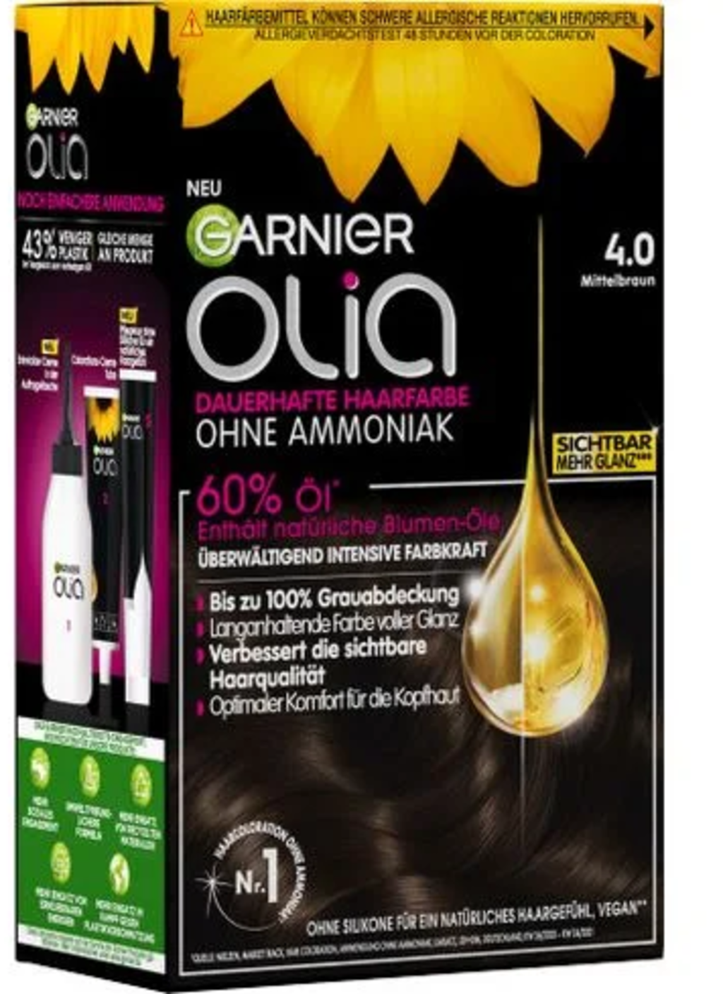 S farbami na vlasy Olia od GARNIER dosiahnete lesklý, intenzívny farebný výsledok ako vz kaderníckeho salónu. Zmes vyvíjača a farbiaceho krému sa nerozteká a veľmi jednoducho sa nanáša. S odtieňom 4.0 dosiahnete bohatú, krásne trblietavú, prirodzenú stredne hnedú. Aj vlasy, ktoré sú už šedivé, sú spoľahlivo kryté na 100 %.