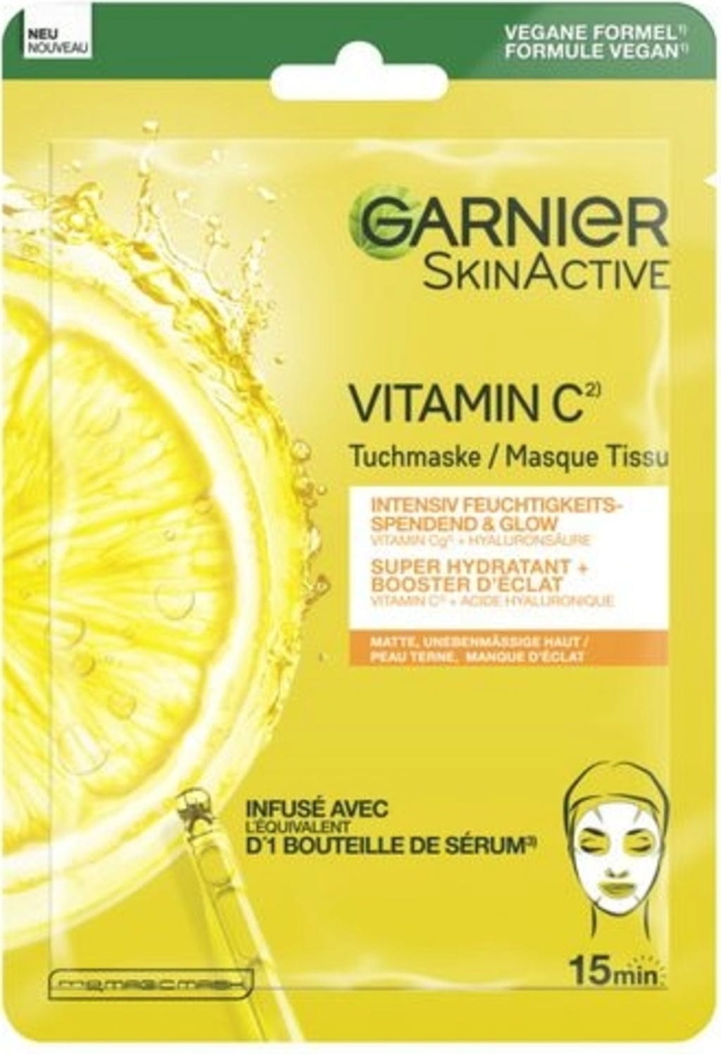 Doprajte svojej citlivej a unavenej pleti opäť lesk s textilnou maskou od GARNIER s vitamínom C. Vegánske zloženie kombinuje vitamín C a kyselinu hyalurónovú na osvieženie pokožky a vytvorenie jemného žiarivého efektu. Okrem toho je pokožka intenzívne hydratovaná a revitalizovaná. Pri opakovanom použití bude vaša pleť viditeľne rovnomernejšia a žiarivejšia.