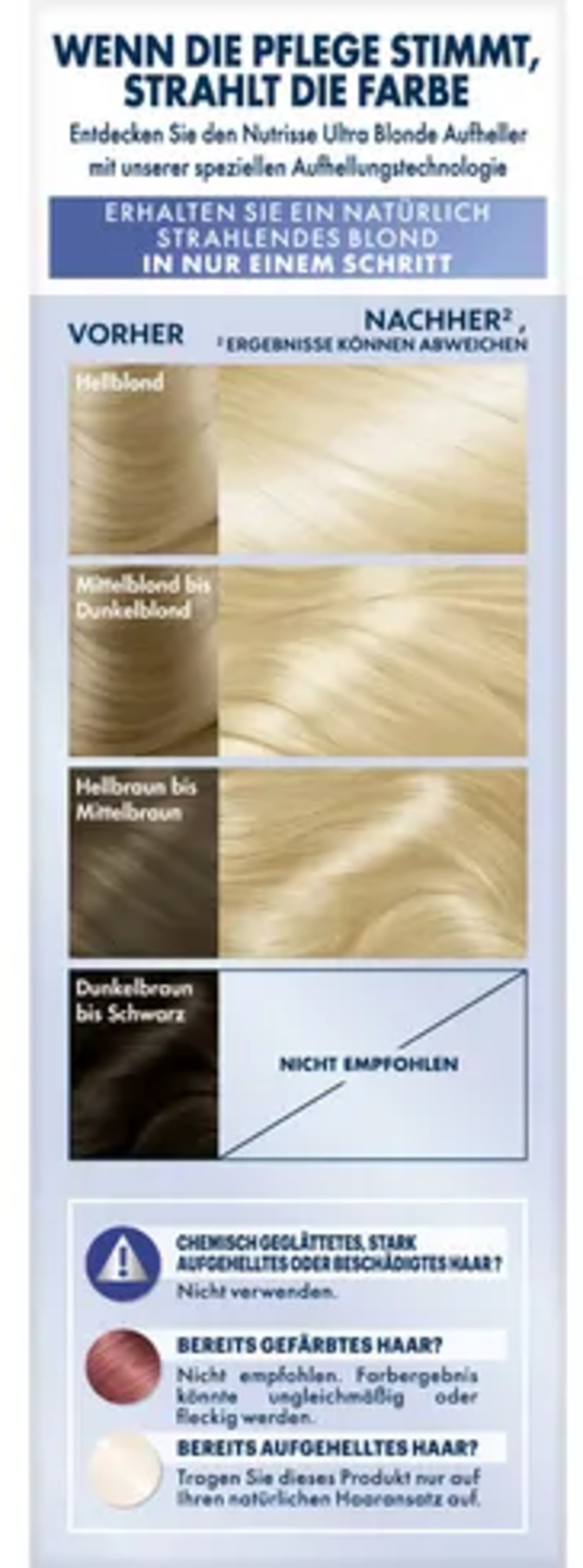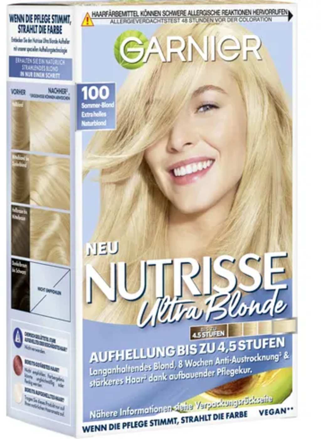 Zosvetľujúca ošetrujúca farba na vlasy Nutrisse Ultra Blonde, 100 extra svetlá prírodná blond umožňuje zosvetlenie až o 4,5 odtieňa. Výsledkom sú žiarivé, blond vlasy s viditeľne väčším leskom. Krémová textúra farbiva sa ľahko nanáša, pretože nesteká. Po použití budú vaše vlasy rozmaznávané regeneračnou kúrou. 5 cenných olejov z olív, bambuckého orecha, avokáda, brusníc a arganu robí vlasy hebkými a intenzívne ich vyživuje.