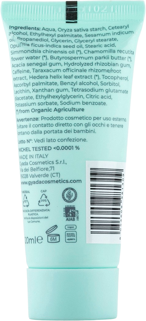 Aqua, Oryza Sativa (Rice) Starch, Cetearylalcohol, Ethylhexyl Palmitate, Sesamum Indicum (Sesame) Seed Oil, Propandiol, Glycerin, Glyceryl Stearate Se, Opuntia Ficus Indica Seed Oil, Stearic Acid, Simmondsia Chinensis (Jojoba) Seed Oil[1], Chamomilla Recutita Flower Water[1], Butyrospermum Parkii (Shea) Butter[1], Acacia Senegal Gum, Hydrolyzed Rhizobian Gum, Caffeine, Taraxacum Officinale Rhizome/Root Extract, Hedera Helix (Ivy) Leaf Extract[1], Tocopherol (Vitamin E), Ascorbyl Palmitate (Vitamin C), Benzyl Alcohol, Sorbit, Lecithin, Xanthan Gum, Tetrasodium Glutamate Diacetate, Ethylhexylglycerin, Citricacid, Potassium Sorbate, Sodium Benzoate