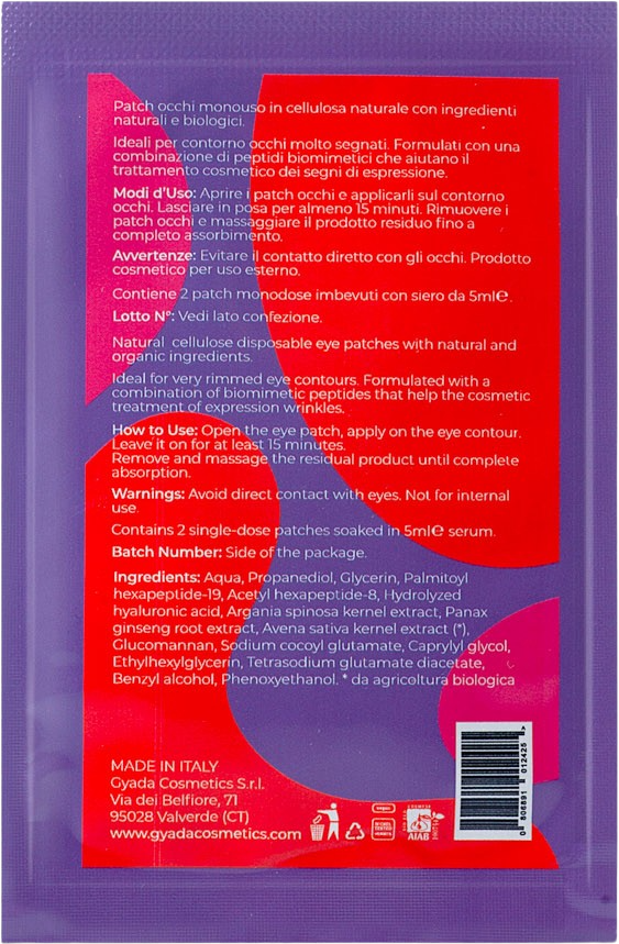 Táto textilná maska z celulózy osviežuje oblasť očí zrelých typov pleti pomocou komplexu proti starnutiu, prírodného peptidového koktailu, kyseliny hyalurónovej a ženšenu. Kombinácia biomimetických peptídov pomáha pôsobiť proti príznakom starnutia pokožky - mimiky tváre.