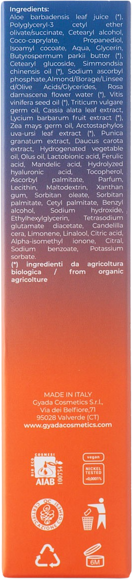 Aloe Barbadensis Leaf Juice[1], Polyglyceryl-3 Cetyl Ether Olivate/Succinate, Cetearylalcohol, Coco Caprylate/Caprate, Propandiol, Isoamyl Cocoate, Aqua, Glycerin, Butyrospermum Parkii (Shea) Butter[1], Cetearyl Glucoside, Simmondsia Chinensis (Jojoba) Seed Oil[1], Sodium Ascorbyl Phosphate (Vitamin C), Almond/Borage/Linseed/Olive Acids Glycerides, Rosa Damascena Flower Water[1], Vitis Vinifera Seed Oil[1], Triticum Vulgare Germ Oil, Cassia Alata Leaf Extract, Lycium Barbarum (Goij) Fruit Extract[1], Zea Mays Oil, Arctostaphylos Uva Ursi (Bearberry) Leaf Extract[1], Punica Granatum (Pomegranate) Extract, Daucus Carota Sativa Extract, Hydrogenated Vegetable Oil, Vegetable Oil, Lactobionic Acid, Ferulic Acid, Mandelic Acid, Hydrolyzed Hyaluronic Acid, Tocopherol (Vitamin E), Ascorbyl Palmitate (Vitamin C), Parfum, Lecithin, Maltodextrin, Xanthan Gum, Sorbitan Oleate, Sorbitan Palmitate, Cetyl Palmitate, Benzyl Alcohol, Sodium Hydroxyde, Ethylhexylglycerin, Tetrasodium Glutamate Diacetate, Euphorbia Cerifera (Candelilla) Cera, Limonene, Linalool, Citricacid, Alpha-Isomethyl Ionone, Citral, Sodium Benzoate, Potassium Sorbate