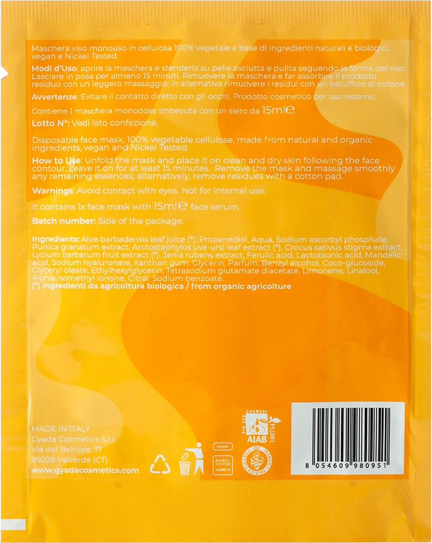 Táto vegan jednorazová maska s vitamínom C, kyselinou mandľovou, kyselinou laktobiónovou a kyselinou ferulovou vyrovnáva pleť. Okrem toho je doplnená o cenné rastlinné výťažky z granátového jablka, plodov goji a bobuľového hrozna, ktoré stimulujú obnovu buniek, znižujú množstvo nečistôt a zaisťujú žiarivú a zdravú pleť.