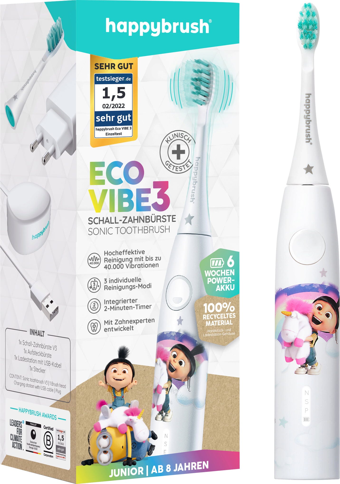 Prichádza dokonalá zubná kefka pre fanúšikov filmu "Ja, zloduch"! Je vyrobená z recyklovaného plastu.Vysoko účinné vibrácie kefky čistia zuby šetrne a spôsobom vhodným pre deti, zatiaľ čo integrovaný časovač pomáha rovnomerne čistiť všetky kvadranty.
