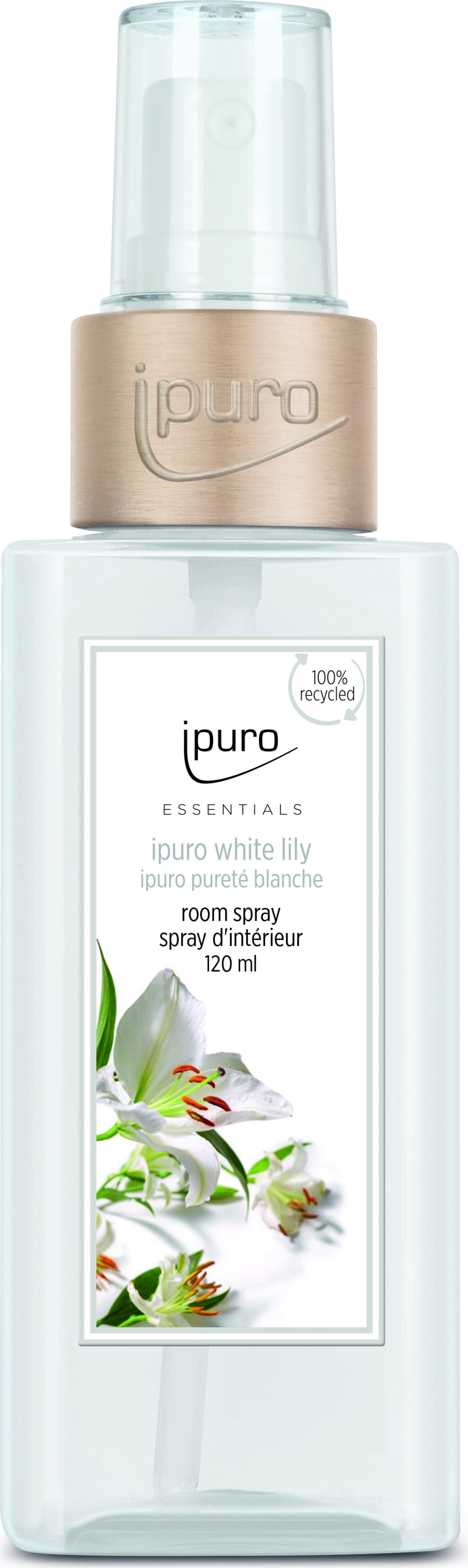 Izbový sprej Essentials White Lily od ipuro vyžaruje kvetinovú sviežosť s tónmi broskyne, konvalinky, jazmínu, klinčeka, bieleho pižma a cédrového dreva.
