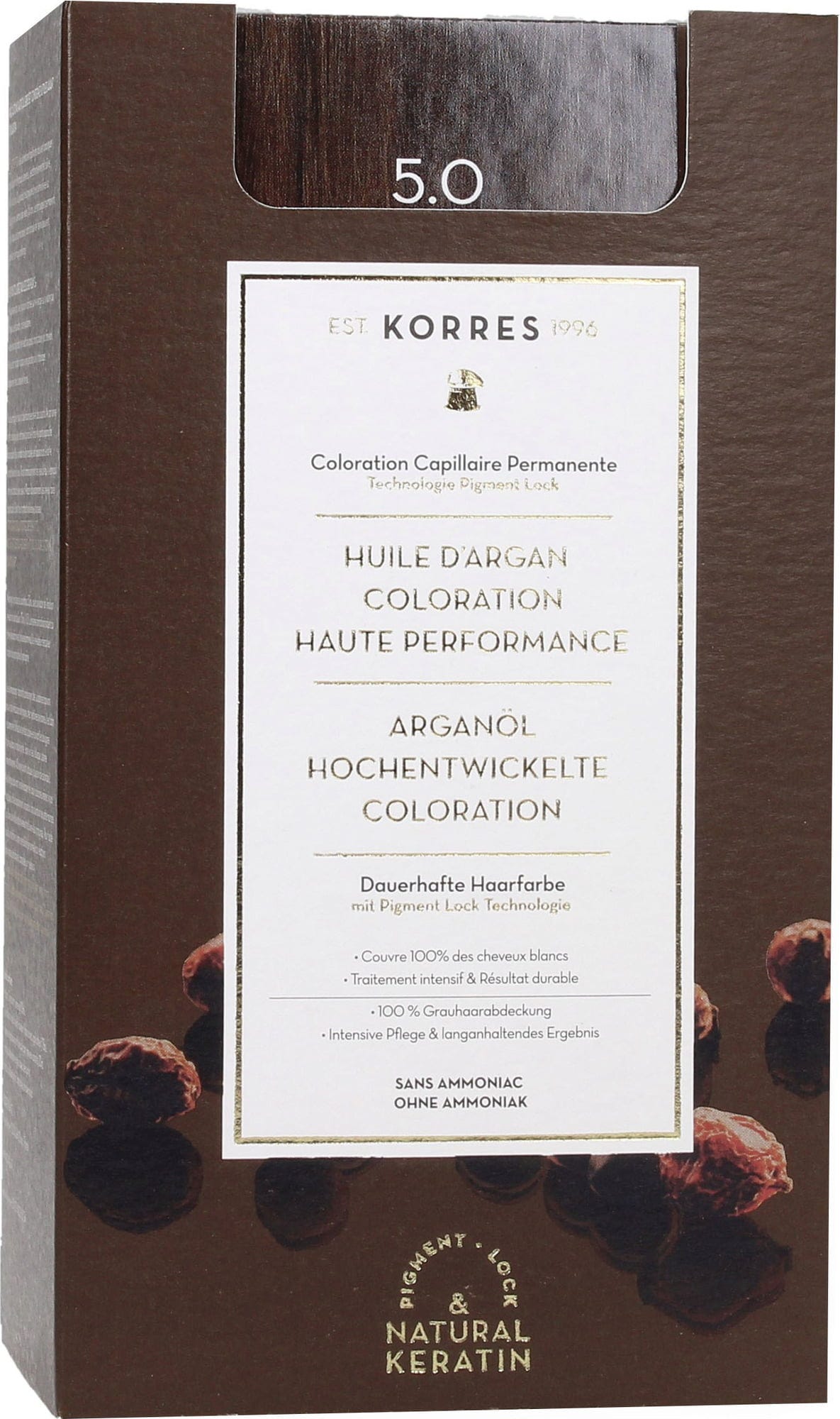 Farba na vlasy KORRES obsahuje cenný arganový olej, prírodný keratín a jedinečnú technológiu Pigment-Lock. Tá uzamyká farebné pigmenty v najhlbších vrstvách vlasov a zaručuje nádherné, prirodzené výsledky - bez amoniaku. Pre krasne lesklú farbu a zakryté šediny!