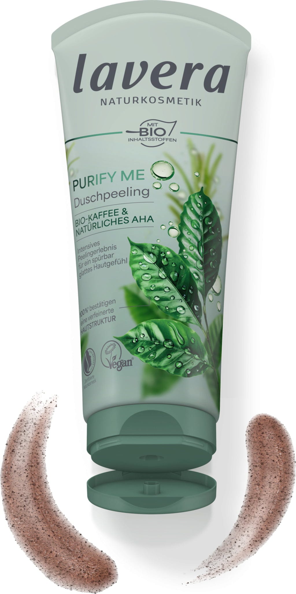 Sprchovací peeling PURIFY ME kombinuje exfoliačné čiastočky z kávy s prírodnými ovocnými kyselinami (AHA). Týmto spôsobom poskytuje počas aplikácie ľahký masážny efekt a jemne odstraňuje odumreté kožné bunky. Zloženie s neutrálnym pH zanecháva pokožku hladkú a hodvábnu.