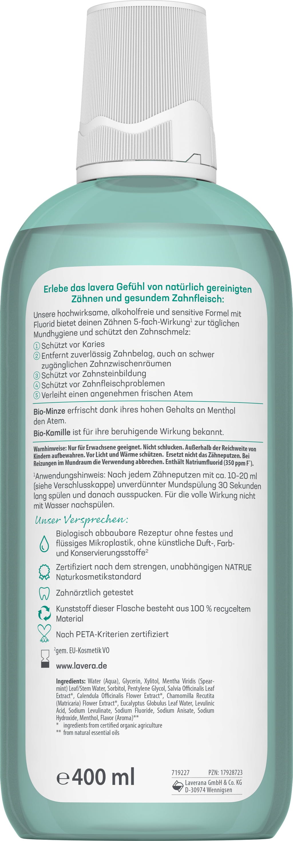 Aqua, Glycerin, Xylit, Mentha Viridis Leaf/Stem Water, Sorbit, Pentylene Glycol, Salvia Officinalis (Sage) Leaf Extract[1], Calendula Officinalis Flower Extract[1], Chamomilla Recutita (Matricaria) Flower Extract[1], Eucalyptus Globulus Leaf Water, Levulinic Acid, Sodium Levulinate, Sodium Fluoride, Sodium Anisate, Sodium Hydroxyde, Menthol, Aroma[2]