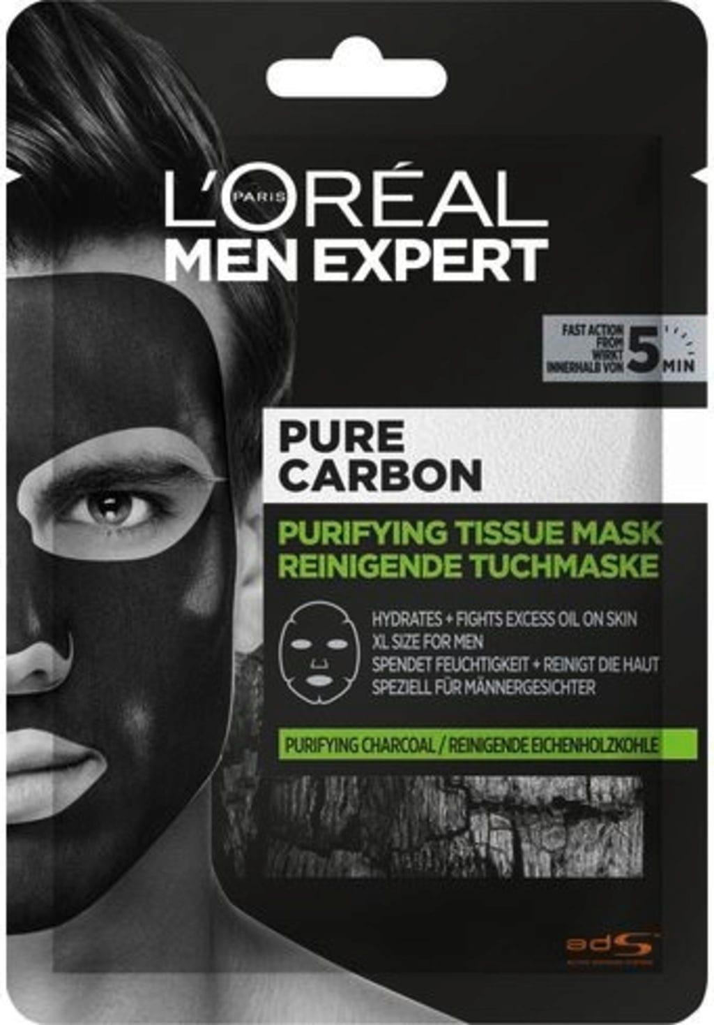 Čistiaca textilná maska MEN EXPERT Pure Charcoal znižuje prebytočný kožný maz a poskytuje namáhanej mužskej pleti intenzívnu hydratáciu.Už po 5 minútach je pleť sviežejšia a živšia!