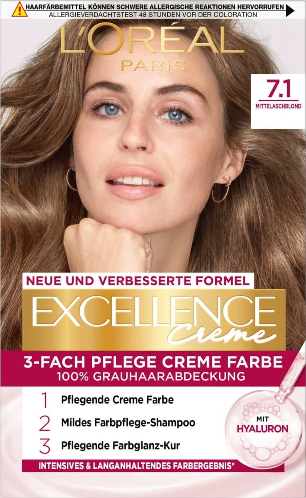 EXCELLENCE Crème v odtieni 7.1 stredne popolavá blond od L'ORÉAL je krémová farba s trojitou starostlivosťou a poskytuje 100 % krytie šedín. Hĺbkové ochranné sérum zaisťuje bohatú a dlhotrvajúcu farbu. Jemný šampón na starostlivosť o farbu vyhladzuje povrch vlasov a šetrne ich čistí. A bohatý ošetrujúci balzam zanecháva vlasy nádherne hladké a lesklé bez zaťaženia.