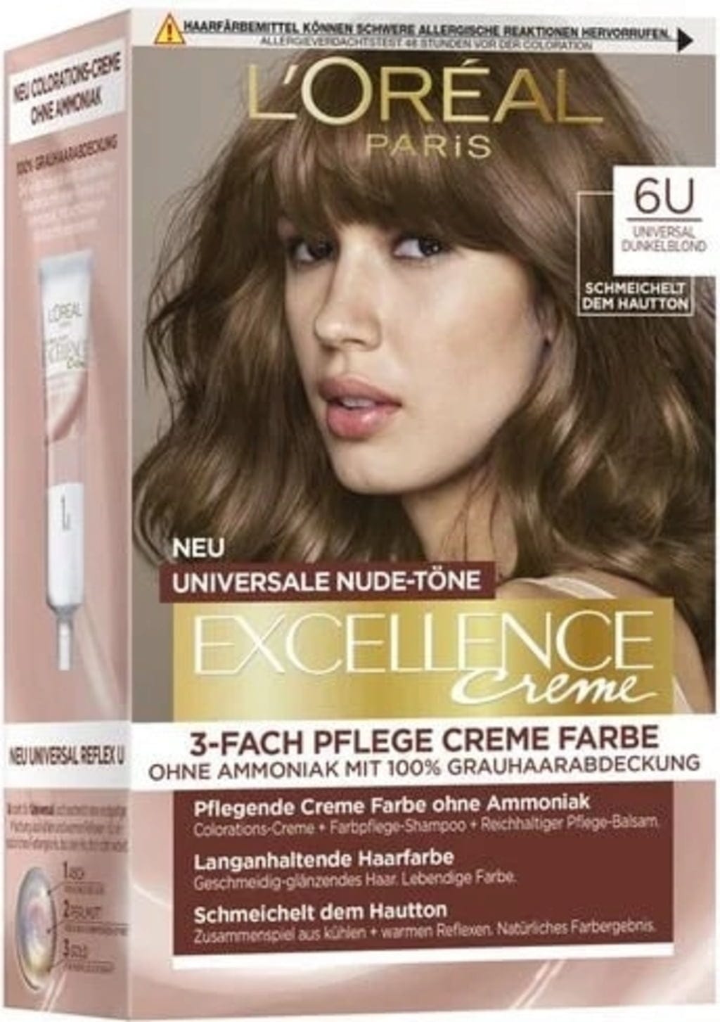 Prilákajte pohľady všetkých s výnimočnými odtieňmi Universal Nudes od L'Oréal Paris. Dodajte svojim vlasom sýtu tmavú blond farbu s farbou na vlasy Excellence Universal Nudes 6U tmavá blond.