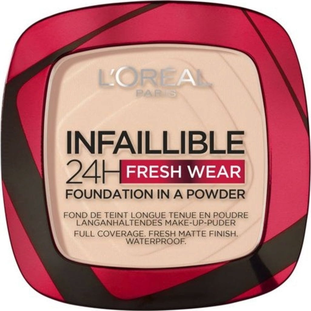 Infaillible 24H Fresh Wear Foundation in a Powder od L'OREAL kryje ako podkladová báza a zmatňuje ako púder. Ľahká textúra je priedušná a nevysušuje pleť. Vďaka dlhotrvajúcim pigmentom púder poskytuje vysoké krytie, ktoré vydrží až 24 hodín. Jemná textúra vydrží aj pri vysokej vlhkosti a je odolná voči vode a potu.