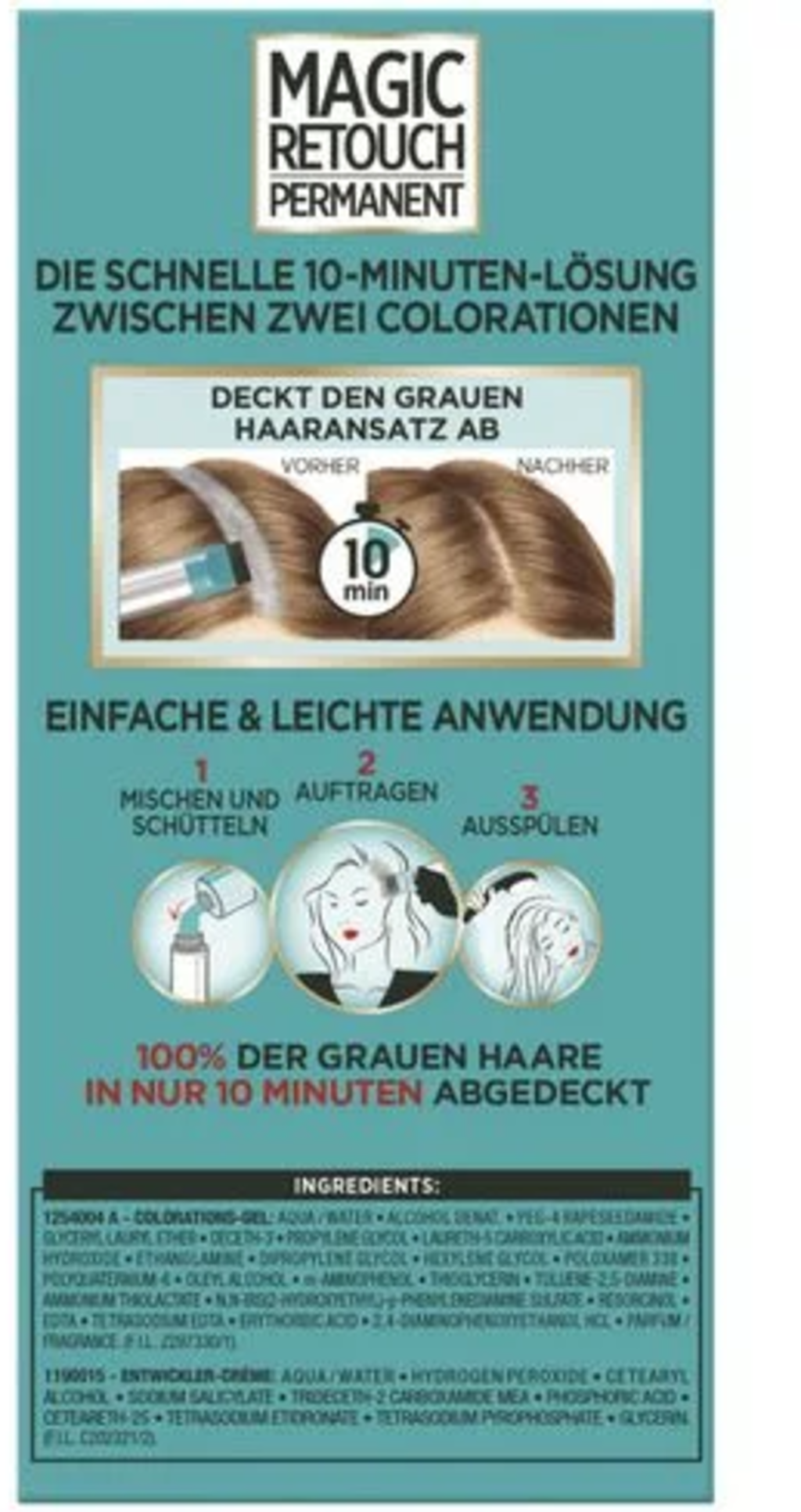 Aqua, Hydrogen Peroxide, Cetearylalcohol, Sodium Salicylate, Trideceth-2 Carboxamide Mea, Phosphoric Acid, Ceteareth-25, Tetrasodium Etidronate, Tetrasodium Pyrophosphate, Glycerin, (F.i.l. C202321/2)