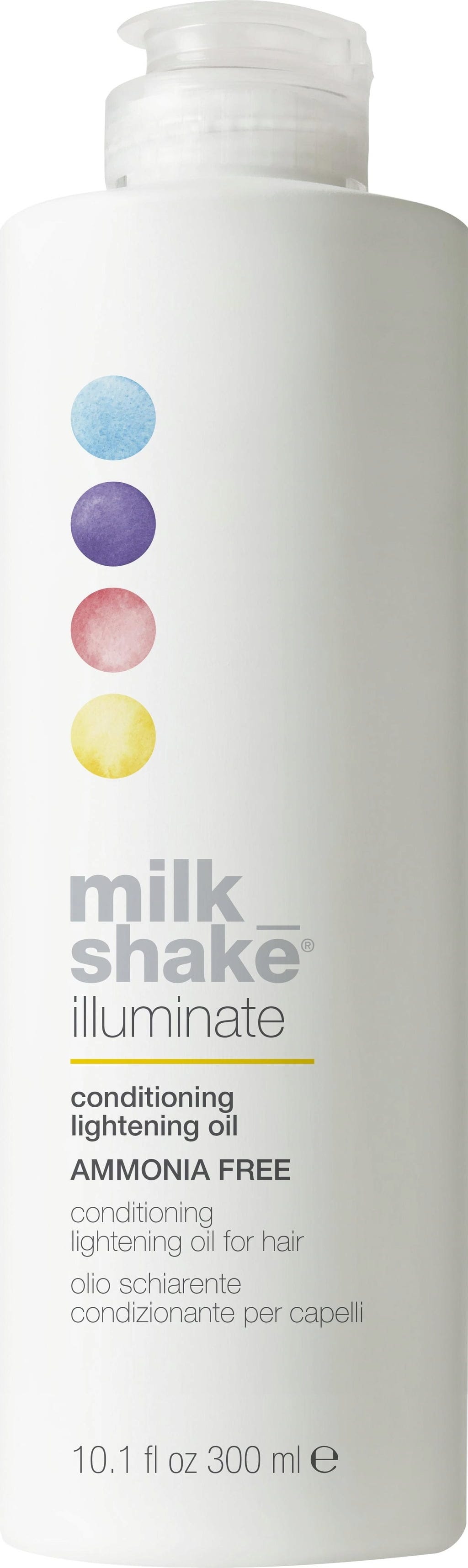 Illuminate conditioning lightening oil od milk_shake je zosvetľujúci olej bez amoniaku, ktorý zosvetľuje vlasy o 3-4 úrovne. Zloženie s certifikovaným arganovým a rastlinnými olejmi sa ľahko nanáša a nekvapká. Okrem toho sú vlasy vyživené a ošetrené vďaka výťažkom z mandarínky, citrónových listov a sladkého pomaranča. Olej dosahuje intenzívnejšie a prirodzenejšie zosvetlenie až o 3 až 4 úrovne.