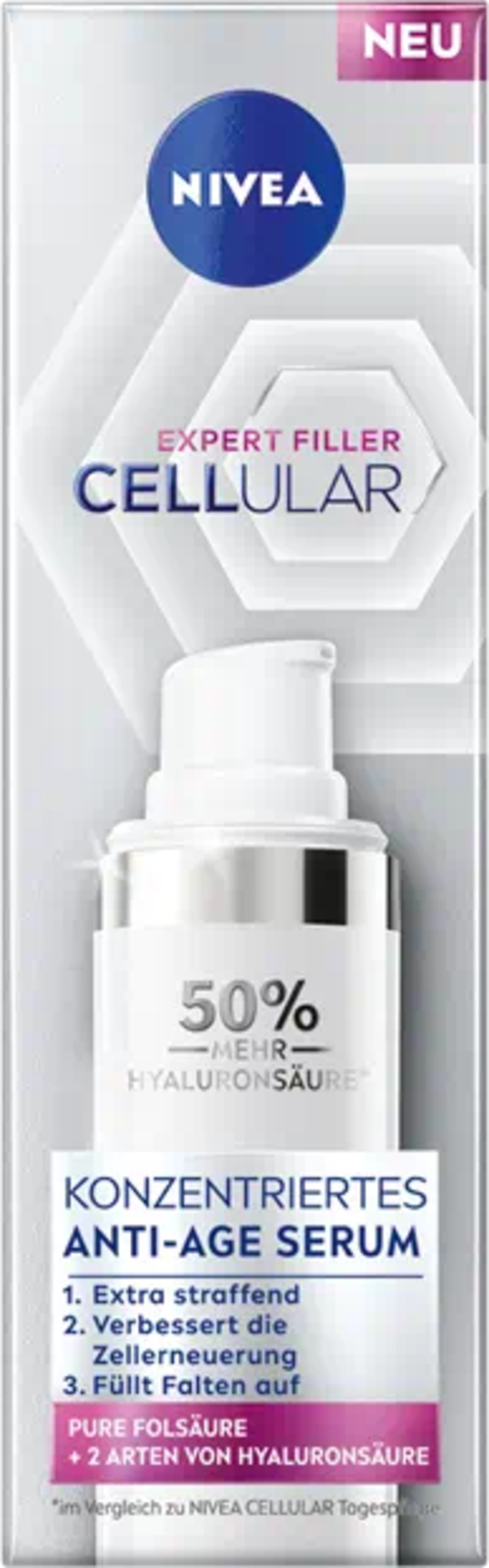 Anti-age sérum Cellular Expert Filler značky NIVEA môžete aplikovať na pokožku tváre ráno aj večer. Obsahuje kyselinu hyalurónovú, kyselinu listovú a extrakt z magnólie, ktoré optimálne ošetrujú vašu pleť a podporujú obnovu buniek.