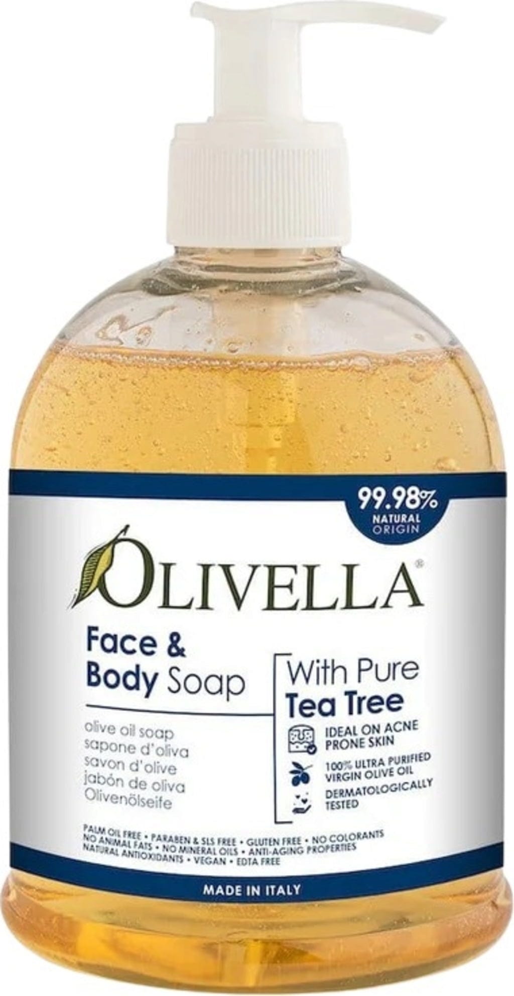 Toto tekuté mydlo na tvár a telo bez palmového oleja značky Olivella je vyrobené z olivového a čajovníkového oleja a je ideálne na mastnú a nečistú pleť. Kombinácia čajovníkového a olivového oleja podporuje pokožku proti nečistotám vďaka vysokému obsahu antioxidantov a polyfenolov. Jemná, korenistá, zemitá vôňa čajovníka a levandule zároveň osviežuje.