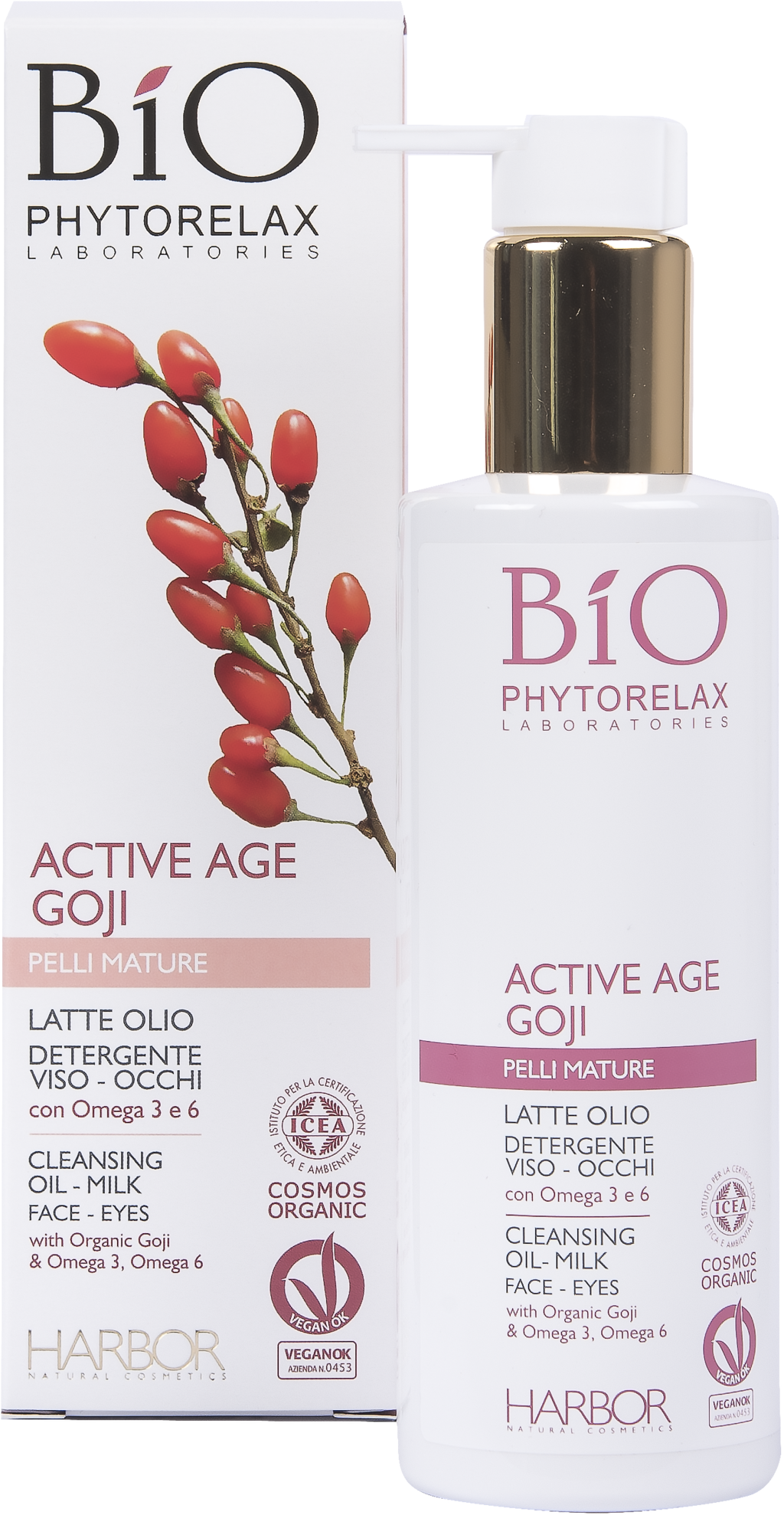 Active Age Goji Cleansing Oil-Milk od spoločnosti PHYTORELAX LABORATORIES zaujme svojím vegánskym zložením, ktoré je založené na 99 % prírodných zložiek. Produkt odstraňuje z pleti make-up a nečistoty a zanecháva ju čistú, vyživenú a rozžiarenú - ideálne pre vašu večernú beauty rutinu!