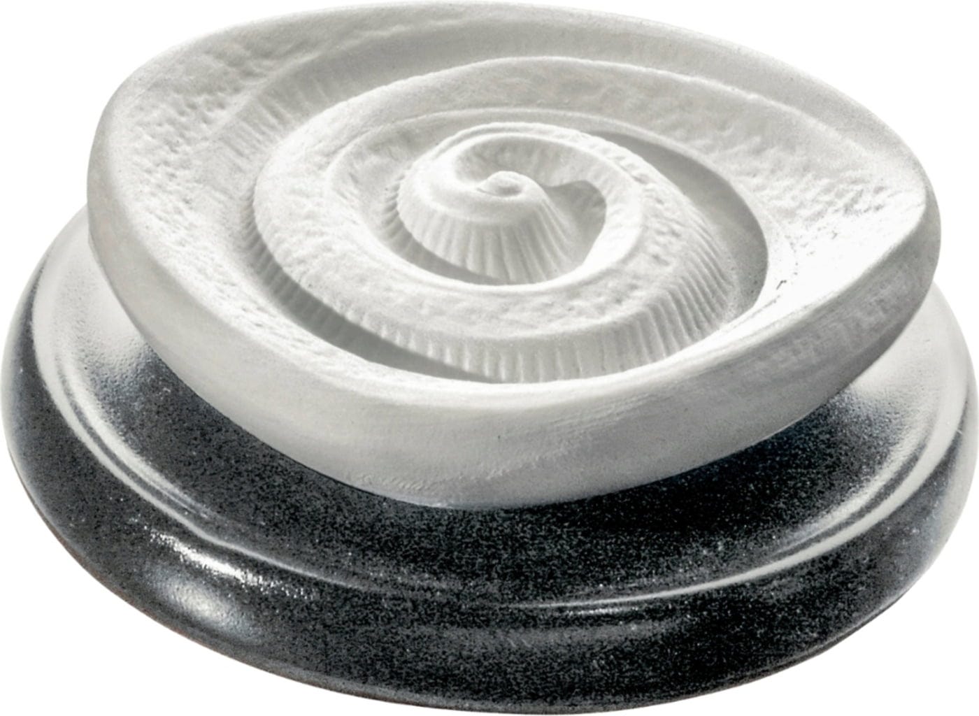 Vonný kameň „Energy spiral“ je vyrobený z terakoty a podložený čiernym keramickým tanierom.