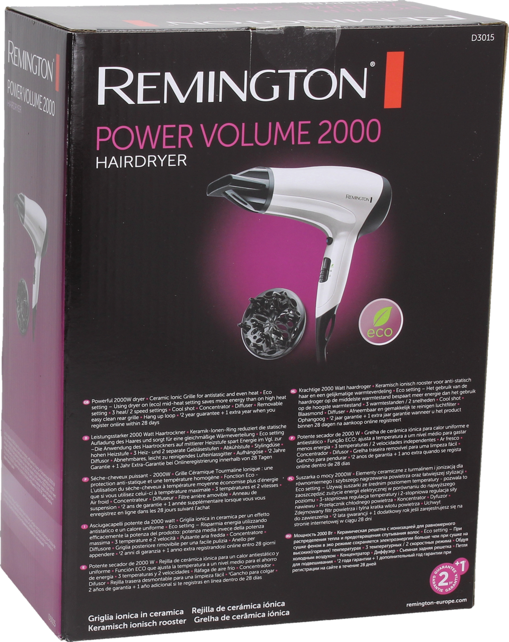 Iónový sušič vlasov Power Volume D3015 od Remington s 2000-wattovým motorom má tri nastavenia teploty, dve samostatné nastavenia prúdenia vzduchu a nastavenie studeného vzduchu pre fixáciu vášho stylingu. Keramický iónový prstenec rovnomerne rozvádza teplo a rýchlo vysuší vaše vlasy. Nastavenie Eco vám tiež šetrí energiu s iba s minimálnym znížením výkonu sušenia*.