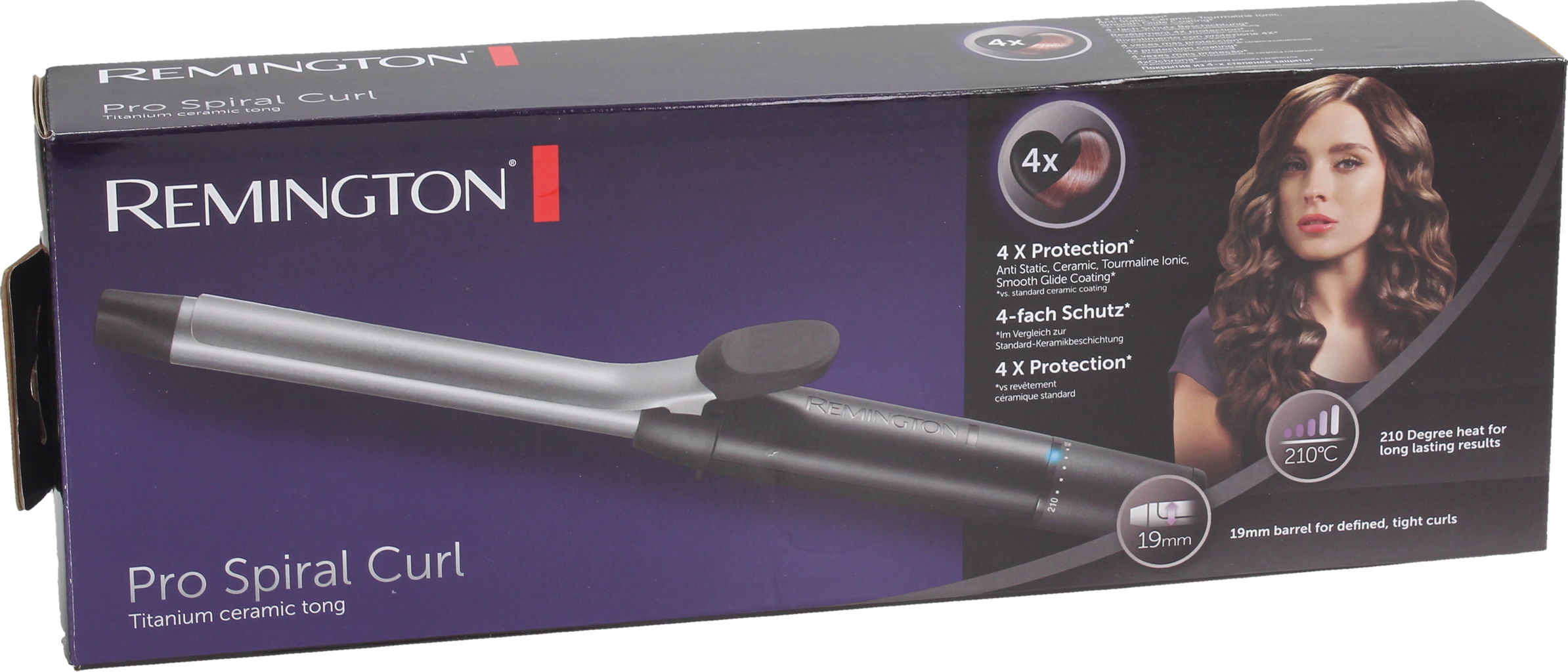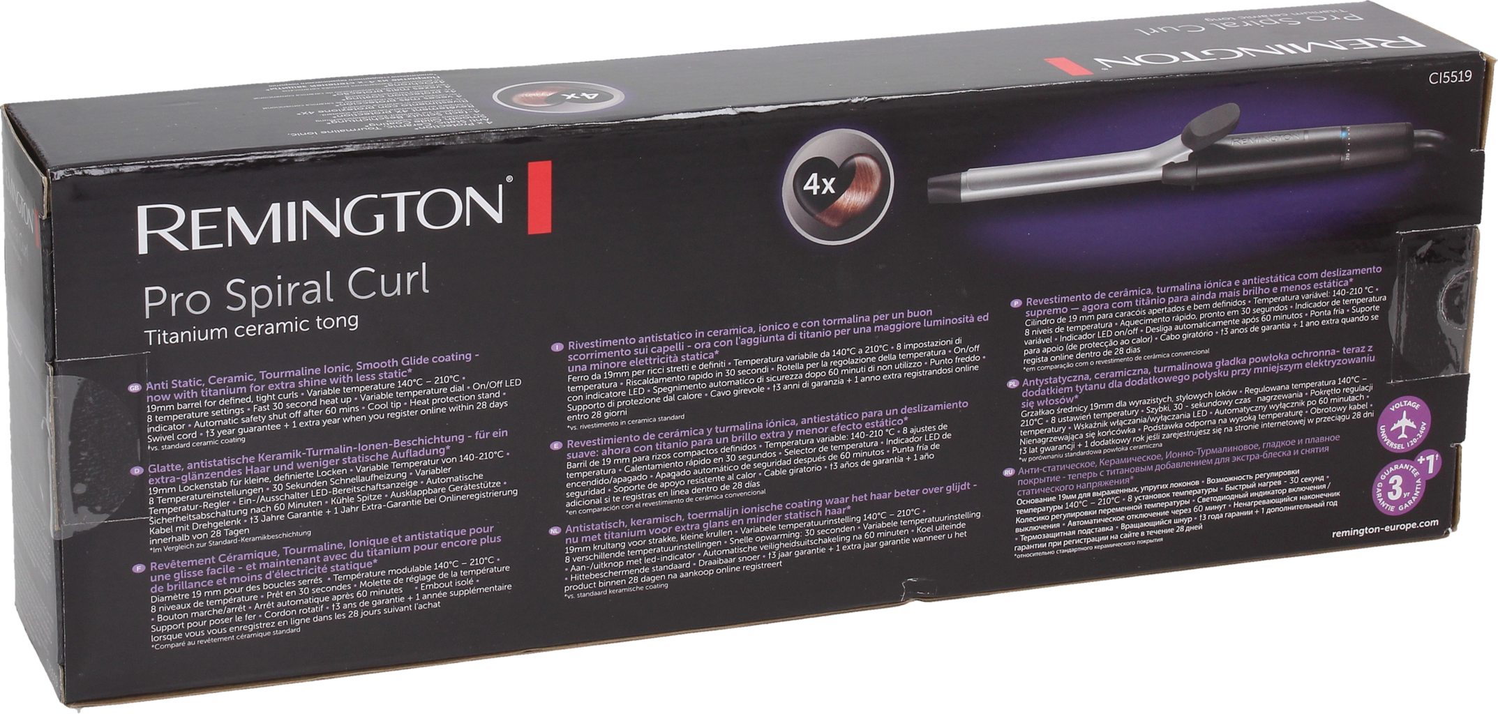 Kulma Pro Spiral Curl CI5519 od Remington - pre definované prstencové kučery za pár sekúnd. Vysokokvalitný antistatický keramický turmalínový povlak zabezpečuje rovnomerné rozloženie tepla a ponúka 4-násobnú ochranu vašich vlasov v porovnaní so štandardným povlak Remington.