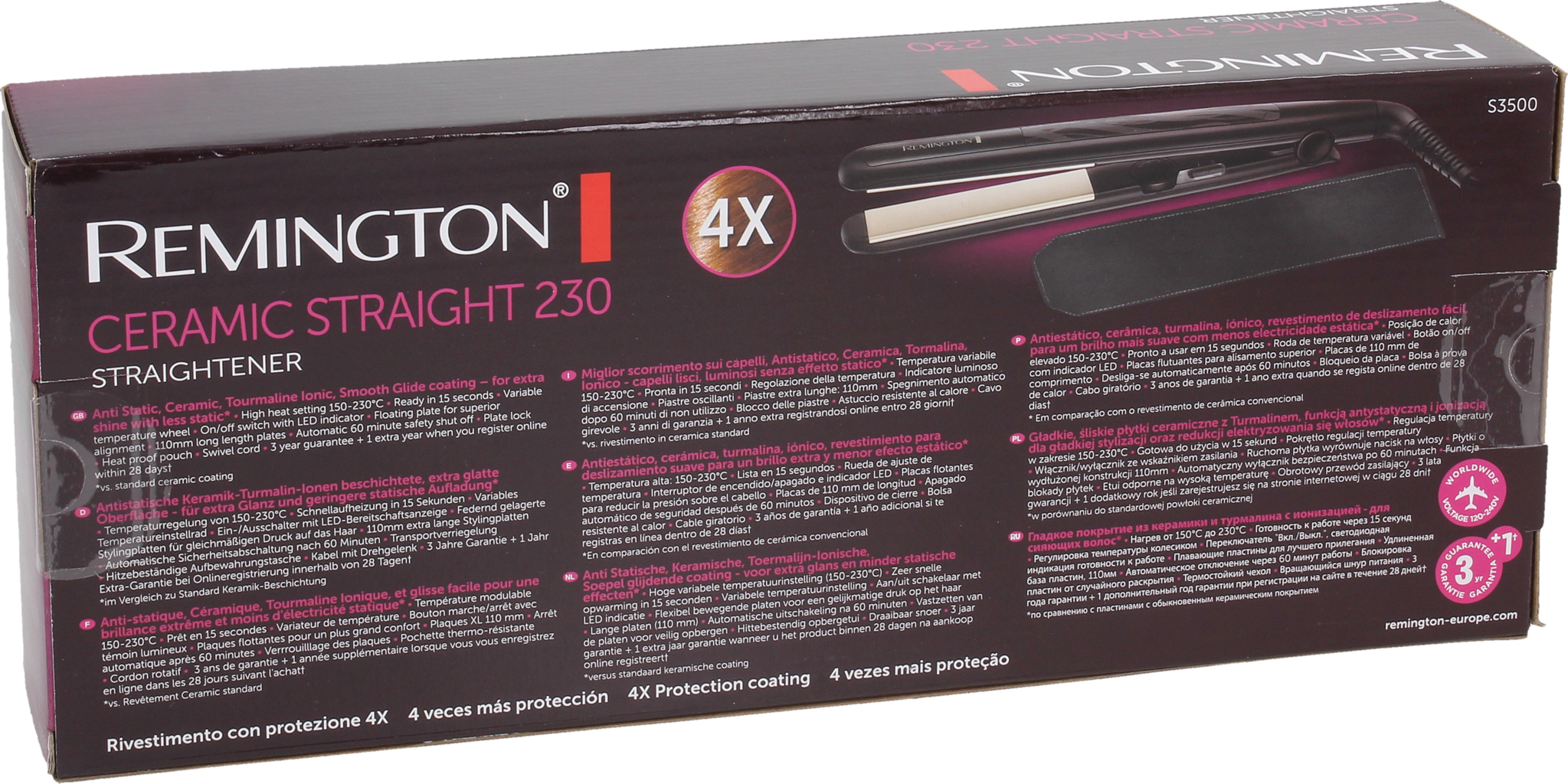 Žehlička na vlasy Ceramic Straight S3500 od Remington má antistatický keramický turmalínový povlak, ktorý zabezpečuje rovnomerné rozloženie tepla a znižuje tvorbu statickej elektriny vo vlasoch. Pružinové stylingové doštičky s dĺžkou 11 cm vyvíjajú rovnomerný tlak na vlasy a zaručujú optimálne výsledky.