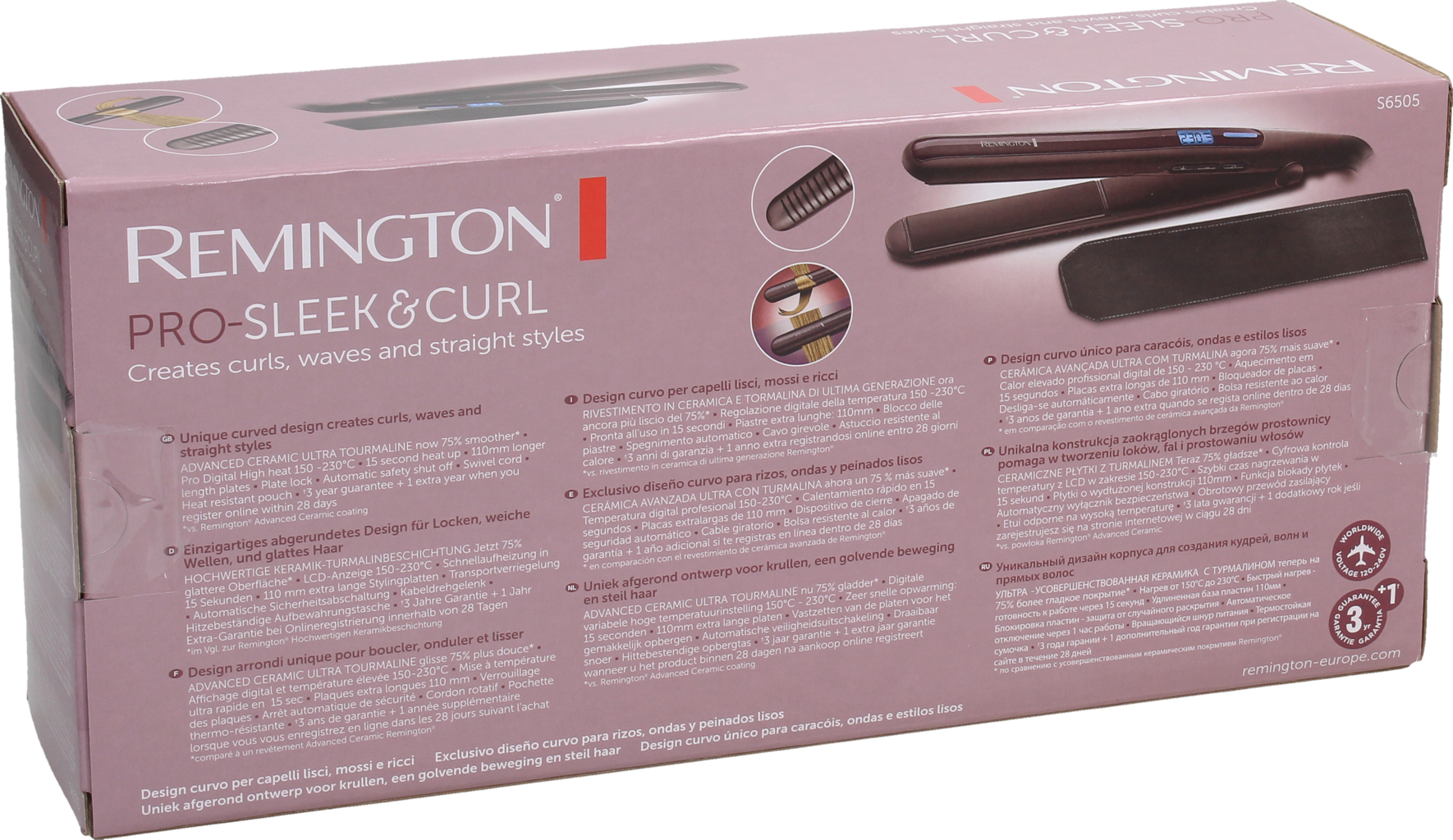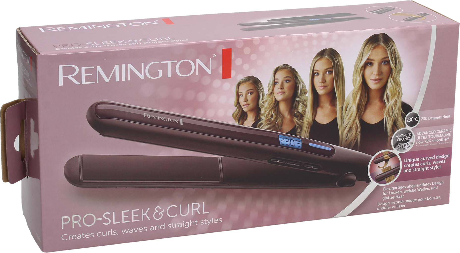 Žehlička na vlasy Pro-Sleek & Curl S6505 od Remington je ideálna na narovnávanie vlasov alebo úpravu kučier a vĺn. Vysokokvalitný ultrakeramický povrch stylingových doštičiek je o 75 % hladší* a umožňuje dosiahnuť mimoriadne hladké a krásne výsledky.