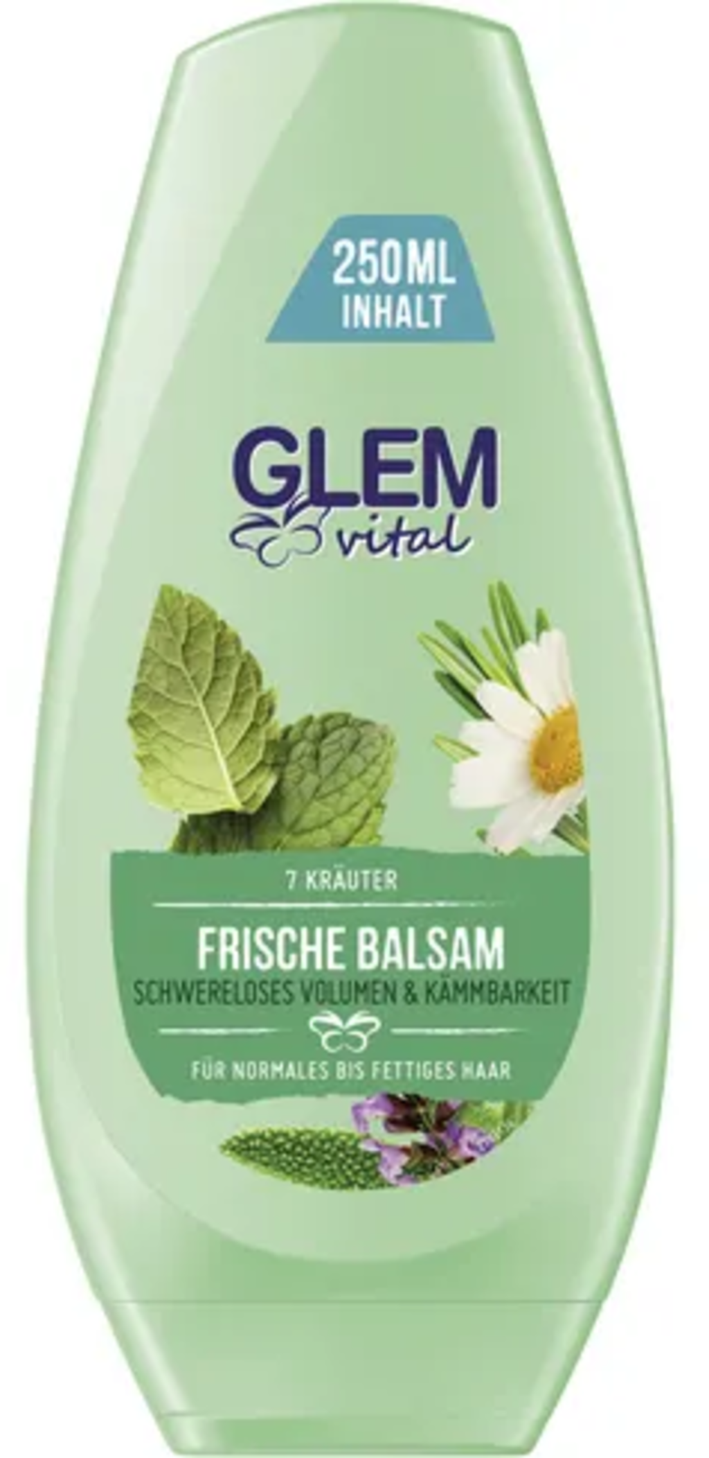 Balzam na vlasy GLEM vital dodáva vlasom dlhotrvajúcu sviežosť a prirodzený objem. Zloženie obsahuje výťažky zo 7 rôznych bylín, ktoré vaše vlasy dokonale rozmaznávajú. Balzam ošetruje normálne až mastné vlasy bez zaťažovania.