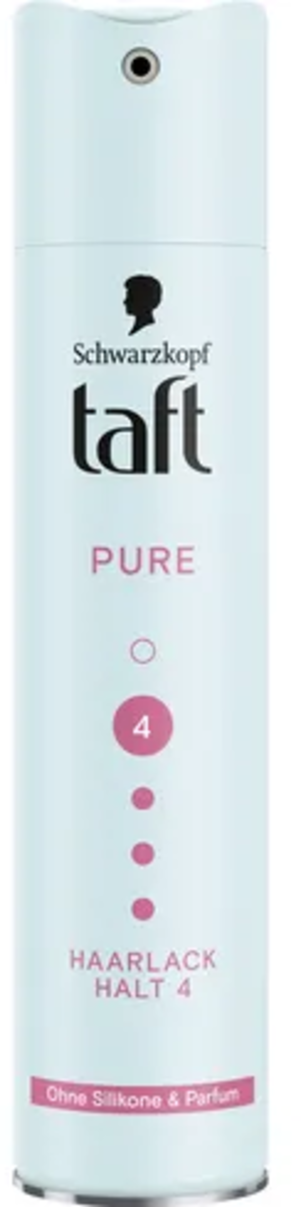 Lak na vlasy Taft Pure od spoločnosti Schwarzkopf ponúka silnú fixáciu pre všetky typy vlasov. Jeho zloženie neobsahuje silikóny a parfumy. S fixáciou 4 zaisťuje dlhotrvajúce držanie bez zlepovania vlasov.
