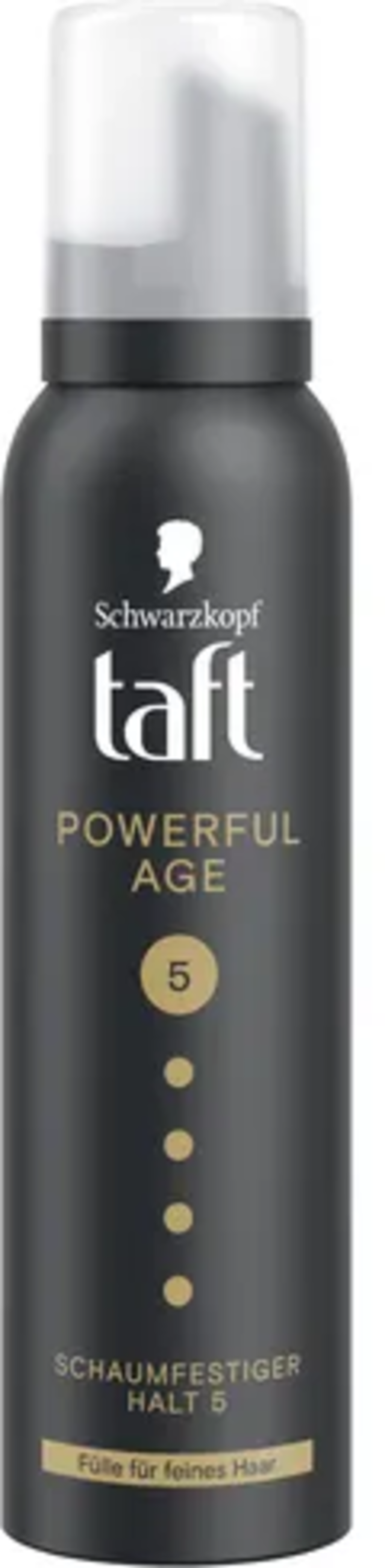 Tužidlo Taft Powerful Age bez obsahu silikónov bola špeciálne vyvinuté pre potreby jemných a rednúcich vlasov. Poskytuje dlhotrvajúcu fixáciu a plnosť bez zaťaženia vlasov. S úrovňou fixácie 5 dodáva vlasom štruktúru, pričom zloženie zároveň chráni vlasy pred poškodením teplom. Pena sa ľahko nanáša a zanecháva vlasy prirodzené a upravené. Zároveň dodáva vlasom väčší objem.