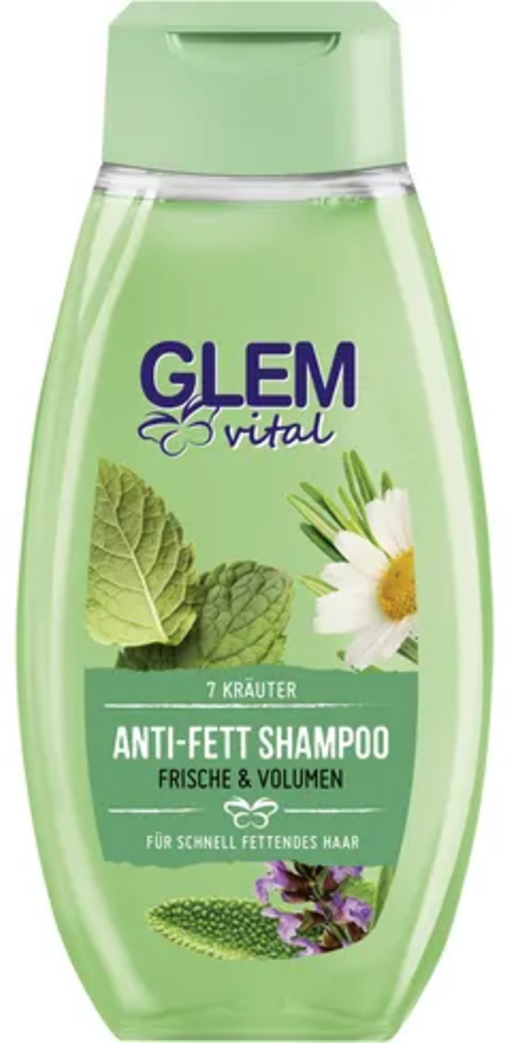 Šampón GLEM vital na mastné vlasy obsahuje 7 cenných rastlinných výťažkov. Výťažky pochádzajú z harmančeka, rozmarínu, šalvie, žihľavy, medovky, prasličky a chmeľu. Zloženie neobsahuje silikóny.