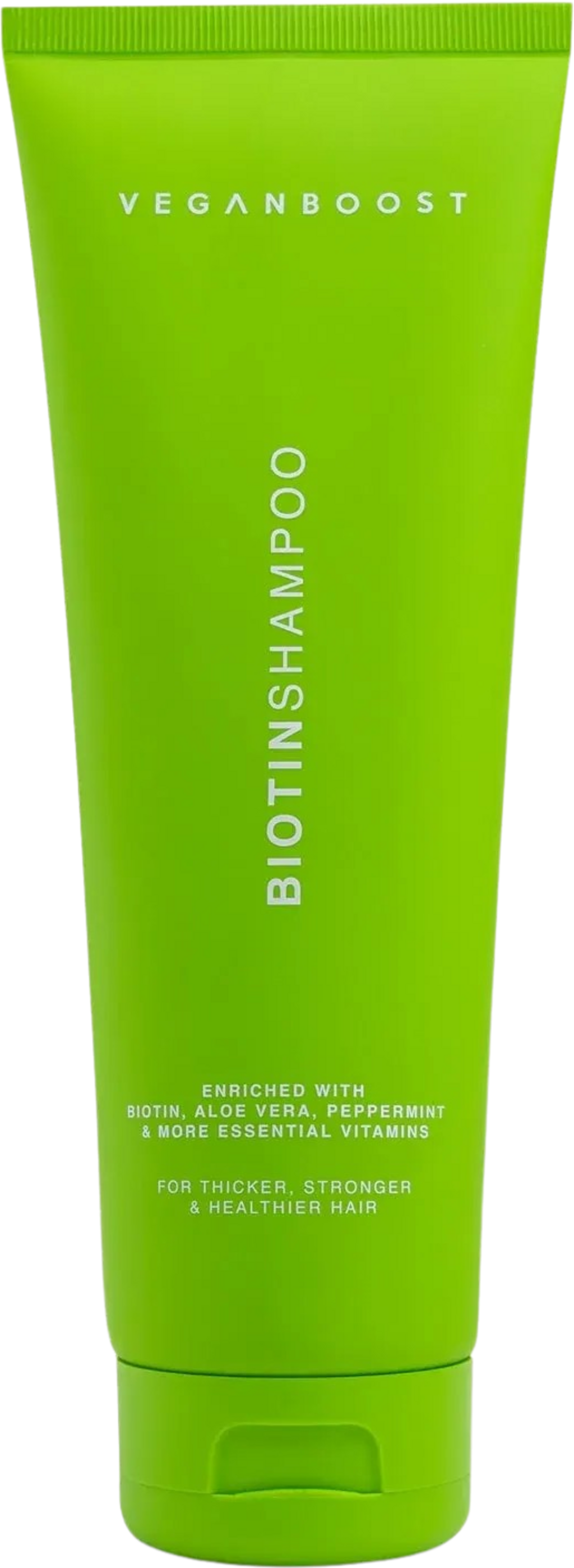 Biotínový šampón od spoločnosti Veganboost je vegánsky produkt, ktorý optimálne čistí a osviežuje vlasy. Zloženie je úplne bez sulfátov a parabénov. Je obohatený o biotín, aloe vera, rozmarín, mätu piepornú, harmanček, kurkumu a nechtík lekársky. Môže sa používať denne.