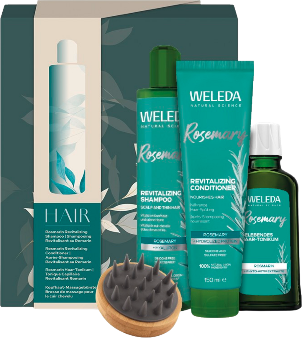 Rozmarínová sada ponúka prírodnú starostlivosť o vlasy s nádherným leskom - pre všetky typy vlasov a citlivú pokožku hlavy. Obsahuje tri revitalizačné kozmetické produkty a kefu na relaxačnú masáž pokožky hlavy ako darček.